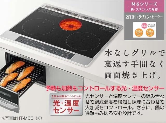 Bếp từ Hitachi HT-M6K (model mới thay thế HT-K6K) nội địa Nhật Bản thuộc dòng bếp phổ thông được nhiều khách hàng lựa chọn với thiết kế mặt bếp đen nguyên khối, thiết kế sang trọng với size bếp 60cm phù hợp với hầu hết các thiết kế của bếp. Cấu tạo bếp từ gồm hai bếp từ và một bếp hồng ngoại và một lò nướng phù hợp cho việc nấu nướng hàng ngày. Bếp từ Hitachi HT-K6K với công nghệ inverter tiết kiệm điện năng và công suất lớn giúp tiết kiệm thời gian và điện tốt nhất