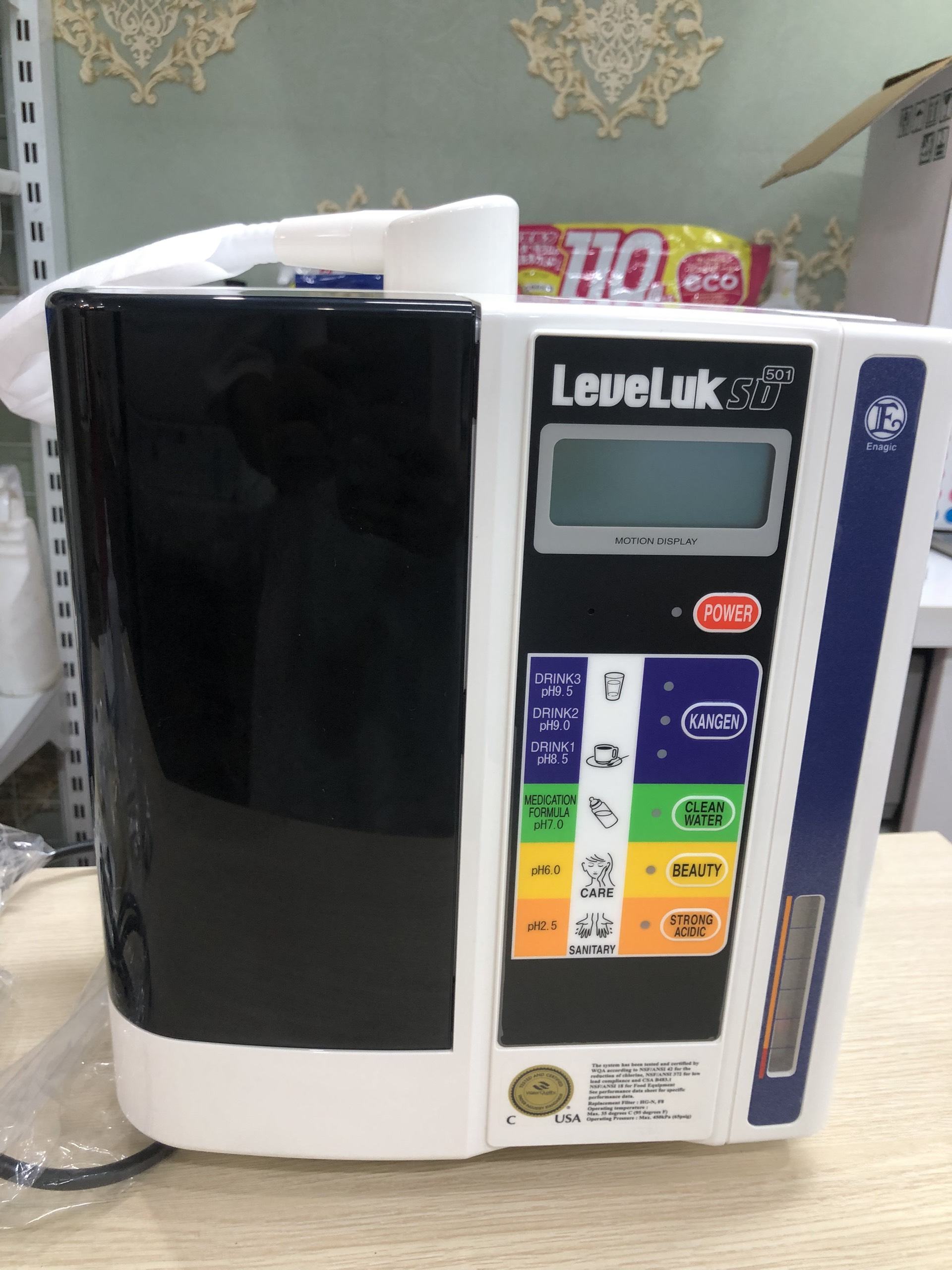 Máy lọc nước Kangen LeveLuk SD501 có thiết kế nhỏ gọn, màu sắc tối giản. Máy được đặt dương tiện lợi và phù hợp với mọi không gian bếp. Màn hình hiển thị LCD dễ sử dụng. Người dùng có thể biết rõ loại nước đang sử dụng, cảnh báo khi cho ra nước axit.
